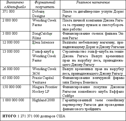 А деньги, между тем, получались нешуточные. В 1999 году суммарный доход «Адельфии» составил 3 миллиарда долларов! Через систему управления наличностью Ригасы лопатили поступления на свое усмотрение. В том же 1999 году 63 миллиона было изъято на покрытие убытков от биржевого трейдинга по частным счетам семейного клана, 4 миллиона пошло на выкуп акций «Адельфии», опять-таки через частный ригасовский счет, ну, и там по мелочи: 700 тысяч бессловесные акционеры «Адельфии» отстегнули на оплату членского взноса Тима Ригаса в гольф-клубе Брайарс-Крик. С полным списком обворовывания публичной компании «Адельфия» семейством Ригасов на общую сумму в один миллиард 200 миллионов долларов читатель может ознакомиться: