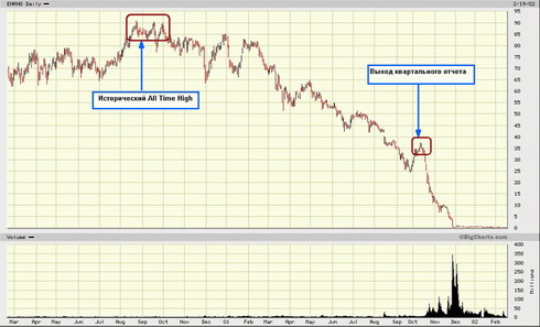 Итак, 16 сентября 2001 звезда Энрона стремительно помчалась к линии горизонта. Однако взгляните на график акций компании за последние два года: