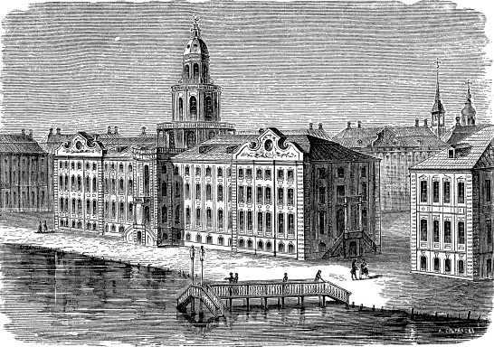 Академия наук во времена Ломоносова. Гравюра XIX в.