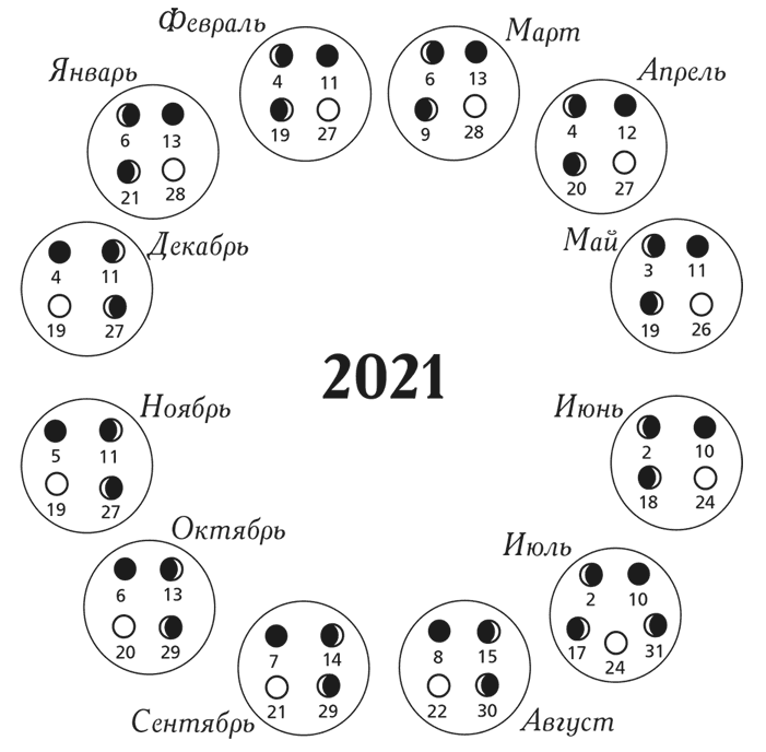 1 – Новолуние, 2 – серповидная Луна, 3 – первая четверть Луны, 4 – выпуклая Луна, 5 – Полнолуние, 6 – рассеивающая Луна, 7 – последняя четверть Луны, 8 – бальзамическая Луна.