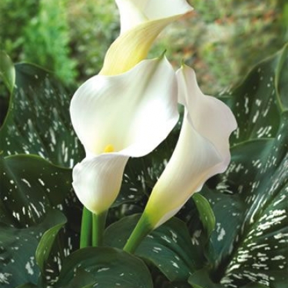 Классический – калла эфиопская, белая. Растение достаточно крупное, цветоносы и стебли вырастают до 1 метра. Листья сохраняют яркий цвет и не отмирают даже