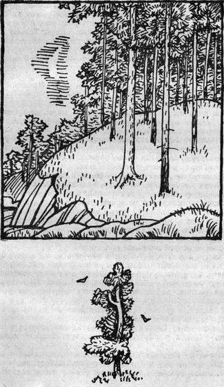 Три ряда нижних венцов, заросших мхом, засыпанных хвоей, лежат прямоугольником. В центре прямоугольника — береза, единственная в этом бору.