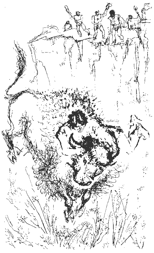 — Го-го-го! — свирепо зарычал он и отскочил в сторону. Его примеру последовали Дак и Нак. Всем видевшим это показалось, что туша исполинского животного насмерть придавила охотника.