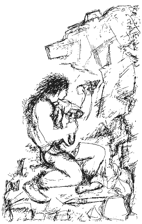 Прихватив оставшийся кусок мяса, Корру поторопился вернуться к каменной фигуре. На террасе у ее подножия он нашел оставленную им палицу. С вершины каменной громады было видно далеко. Желтые известковые скалы сливались вдали с потемневшим небом. Вокруг было пустынно и тихо. Редкие кустики на песчаной почве гнулись под порывами ветра. Охотник напрягал глаза в тщетной попытке обнаружить людей. Корру не сомневался в том, что они где-то поблизости.