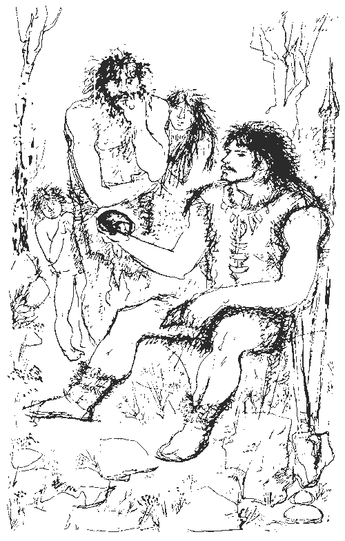 Корру понимал, что встретился с людьми, которые многого не знают, во всяком случае знают меньше маумов. И горбатому охотнику захотелось научить окха-гухов изготовлять более удобные каменные орудия, показать им, как нужно шить одежду, пользуясь каменными проколками, костяными иглами и высушенными сухожилиями животных. Корру обнаружил также, что его новые друзья не имеют изделий из камня: нет у них каменных фигурок человека и зверей. Горбатый умелец решил в первую очередь научить окха-гухов высекать из мягкого известняка фигурки, необходимые для обрядов. На третий день пребывания среди окха-гухов Корру раздобыл небольшой круглый камень; из него можно было вырезать любую фигурку. Корру вышел из пещеры и взобрался на невысокий песчаный холмик. Кроваво-огненный закат предвещал ветер. С болота тянуло сыростью. Корру задумался, что ему изобразить.