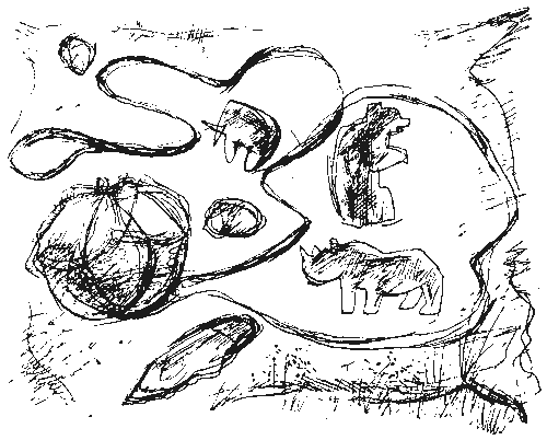Старый медведь безбоязненно прошел мимо людей и улегся у входа в пещеру. Морда зверя была обращена к живительным лучам солнца. Нижняя губа его свесилась, обнажив желтые корешки зубов, глаза были прикрыты — он задремал. Шэрк лежал совсем неподвижно… И Молодой Мамонт с товарищами не теряли времени. Когда Шэрк, кряхтя, наконец поднялся и, тяжело ступая, удалился прочь, у каждого ваятеля работа была уже почти закончена. Однако молодые охотники еще довольно долго повозились, тщательно отделывая свои каменные фигурки. Каждому из них хотелось, чтобы его работа была признана у большого костра лучшей.