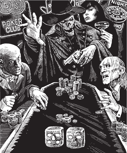 Наконец Джо оказался перед фальшивым трехэтажным фасадом, сверкающим дьявольской радугой и увенчанным синеватыми огнями святого Эльма. В середине была широкая дверь, из нее тоже вовсю лился свет. Над дверью золотой огонь вновь и вновь выводил слова «Зал Костей», обрамляя каракули дикими завитушками, а мрачное красное пламя раз за разом изрыгало: «Игорный дом».