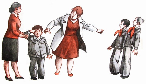 В учительской мы увидели Ираиду Кондратьевну, зарёванного Гошу и пыхтящую, как маневровый паровоз, его мать. Она тут же поднялась с дивана и, указывая на нас, затрубила своим громким голосом:
