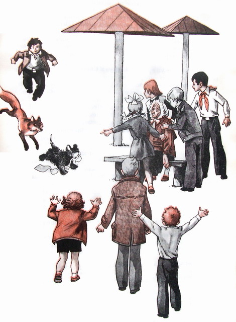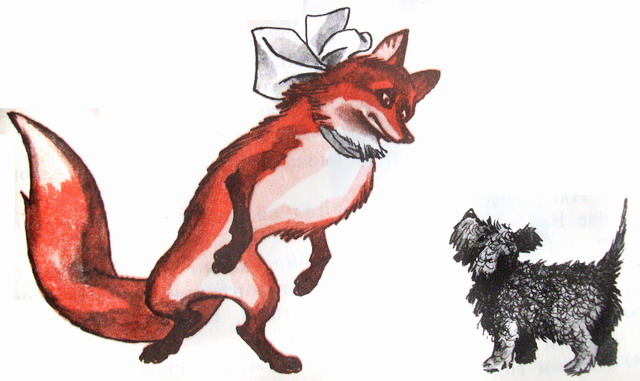 Старушка не успела раскрыть рта, как из подъезда выскочил Гошин Кубарик и бросился к лисе. Та спрыгнула со скамейки, и они стали обнюхивать друг друга, а потом обниматься передними лапами и вилять от удовольствия хвостами. Лиса — большим пушистым, а Кубарик — коротеньким и смешным. Лисе здорово мешал поводок, и Оля попросила: