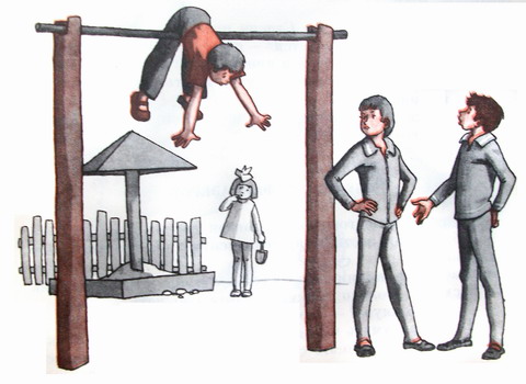 Друзья хотели уговорить её продолжать занятия, но тут во двор вышел третьеклассник Вовка Чулков. Гриша и Стасик оставили Олю