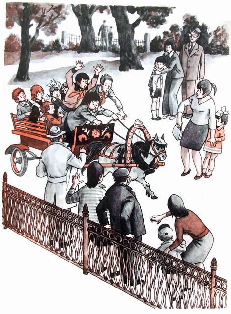 Проехали один круг, начали другой. Гоша, очевидно, дёрнул не за ту вожжу: пони свернула с круга и выехала на дорожку зоопарка. Как это мы не закрыли за собой калитку! Цокая маленькими подковками, она побежала по дорожке в глубь сада. Мы начали подпрыгивать в тележке, как арбузы. Люди испуганно шарахались в стороны. Павлик перехватил у Гоши вожжи и стал их натягивать изо всех сил и кричать: «Тпру!» А я кричал посетителям зоопарка, чтобы сторонились. Пони добежала до своей конюшни и встала. Мы быстро ссадили ребят.