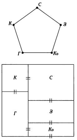 В небольшом масштабе эта задача не представляет интереса, но в ситуации, когда, например, на одном этаже офисного здания требуется разместить помещения, принадлежащие банку, министерству, администрации города и другим структурам, с помощью анализа стандартных маршрутов можно найти оптимальное расположение помещений, которое поможет упростить взаимодействия между организациями. Например, офисы одинаковой площади можно расположить на этаже в соответствии с одной из следующих пяти схем и эквивалентных им графов смежности.