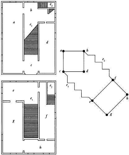 Точками также можно обозначить наружное пространство или лестницу. Если речь идет о многоэтажных домах, то каждому этажу можно поставить в соответствие граф смежности и соединить точки, доступные с разных этажей, не прямыми, а ломаными линиями, которые будут обозначать лестницы.