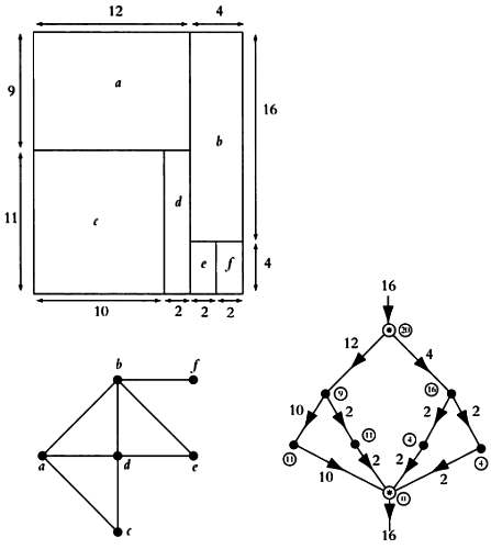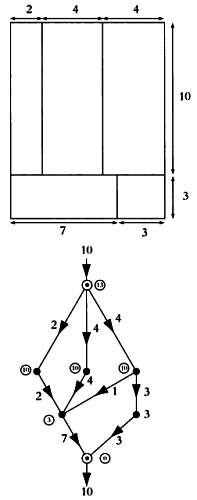 На каждой вершине внутри круга указывается расстояние между стеной, соответствующей этой вершине, и следующей стеной, расположенной на чертеже горизонтально. В начальной вершине, точнее на входящем ребре, указывается общая ширина помещений, а внутри круга — их общая длина. В конечной вершине длина должна быть равна нулю, а на исходящем ребре должна быть нанесена общая ширина помещений. Заметим, что граф будет составлен неверно, если сумма значений для ребер, исходящих из данной вершины, будет не равна сумме значений для входящих ребер. Такие графы позволяют проверить правильность внутренних размеров помещений.