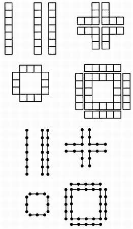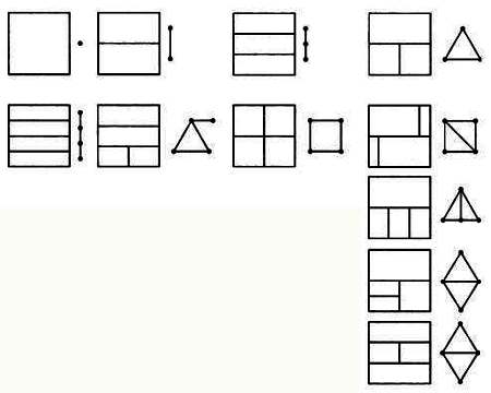 на которые мы хотим разбить квадрат. Было подсчитано, что для n = 1, 2, 3, 4, 5 и 6 существует соответственно 1, 1, 2, 7, 22 и 117 различных способов разбиения, которые не являются топологически эквивалентными.Для n >= 7 эта задача до сих пор не решена. По некоторым оценкам,
