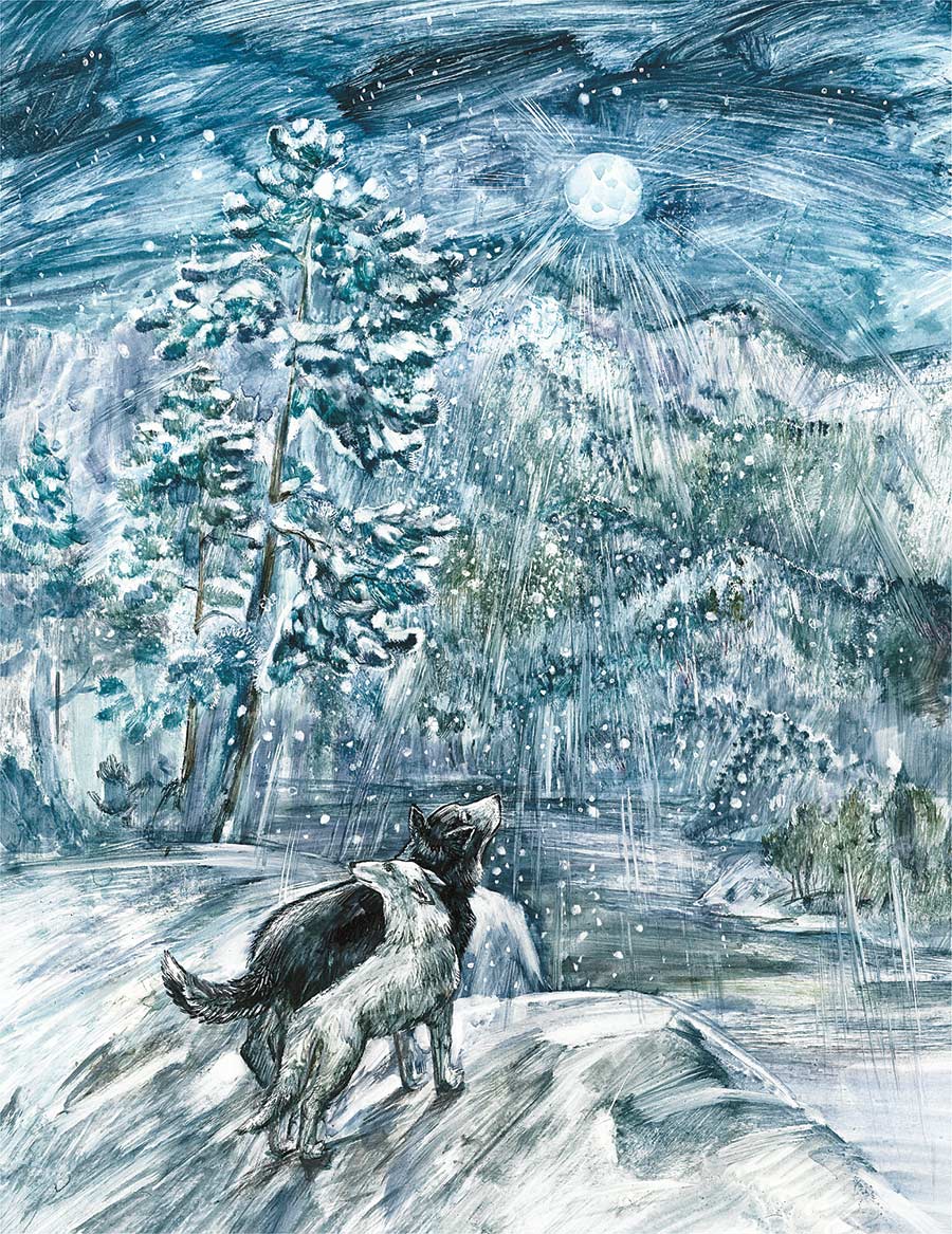 В эту ночь они нашли для себя убежище в густом можжевельнике, и когда улеглись на мягком ковре из хвойных иголок, который оставался не засыпанным снегом, то Серая волчица тесно прижалась к Казану своим тёплым телом и стала зализывать ему раны. День начался бархатным снегопадом, снег был такой белый и такой густой, что они не могли видеть перед собой и на десять прыжков. Было совсем тепло и так тихо, что весь мир казался им состоявшим из одного только движения и шороха падавших снежинок. Весь этот день Казан и