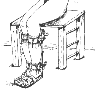 Следующая группа приспособлений основывалась не на принципе выворачивания или растяжения конечностей допрашиваемого, а на их сжатии. Здесь применялись разного рода тиски, от самых примитивных до сложных, типа «испанского сапога».
