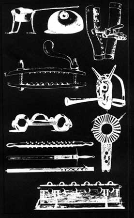 Это, если можно так выразиться, парадно-зрелищная сторона пыточного дела, которая, по сути, является вершиной айсберга, основная часть которого таится в глубинах мрачных подземелий, оснащенных хитроумными и зловещими приспособлениями, порожденными неуемной энергией разрушения, превалирующей над многими другими энергиями человеческой личности