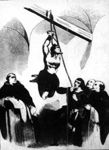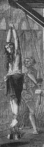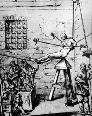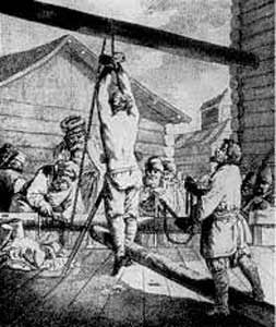Палач, поплевал на руки, хватается за веревку и тянет ее вниз. Связанные руки узника поднимаются все выше и выше, причиняя страшную боль в плечевых суставах. Вот вывернутые руки уже над головой, и узник вздергивается