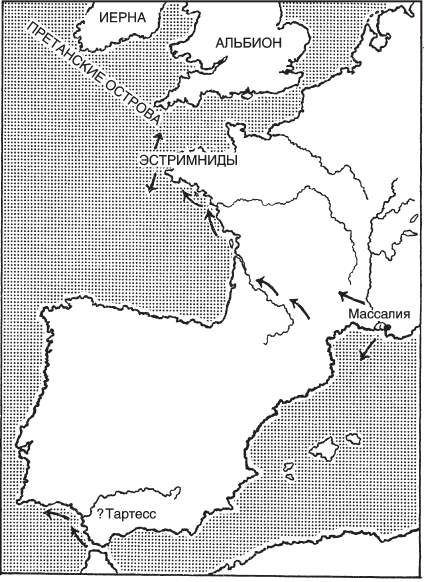Британия и Ирландия. В VI веке до н. э., точнее, не позже 530 года, жители Массалии предприняли путешествие мимо восточного берега Испании, через Геракловы столбы и вдоль Атлантического побережья к городу Тартессу (карта 1). Очевидно, это было не первое такое плавание из Массалии, но важно то, что один из вернувшихся на корабле мореходов составил отчет, в котором привел сведения не только о берегах Испании, но и о землях, лежащих дальше к северу вдоль атлантических морских путей Европы. Описание этого путешествия известно под названием «Массалиотский перипл» и сохранилось в отрывках, процитированных в IV веке н. э. Руфом Фестом Авиеном в поэме «Ora Maritima». Некоторые особенности этого перипла свидетельствуют о том, что он был сочинен до завоевания Тартесса карфагенянами, приведшего к прекращению для колониальной Греции торговли в Атлантике.