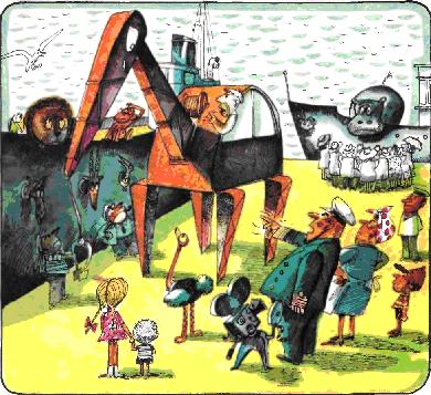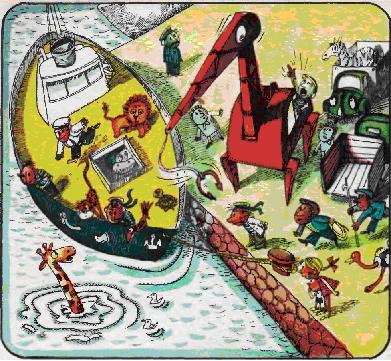 Крану было очень стыдно за свой промах. Он начал торопливо выгружать следующего зверя — бегемота. Наверное, от большой спешки так и получилось — кран впопыхах опустил бегемота не на берег, а на палубу теплохода, на котором пассажиры собирались отплыть в дальний рейс.