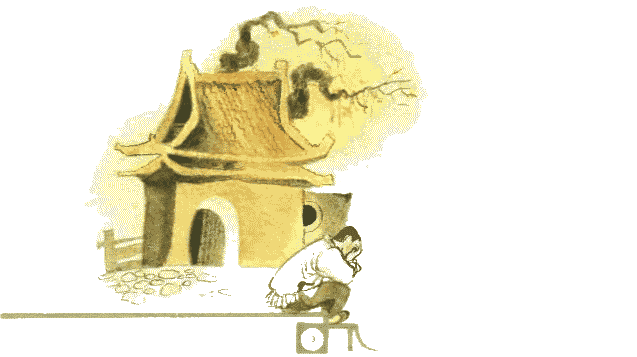И только помещик скрылся за поворотом, как на Несчастливого посыпались беды. Рис на поле поклевали птицы, лодку унесло в открытое море, чумизу побило градом. А ночью из очага выпал уголёк на циновку, и циновка сразу же вспыхнула. Хорошо, что собака разбудила Несчастливого лаем, а то бы вся фанза сгорела.