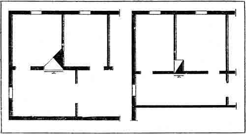При коридорной планировке здания можно одну печь размещать так, чтобы она отапливала два соседних помещения и выходила топкой в коридор. Вместо коридора одной печью можно одновременно отапливать три комнаты. На рисунке 19 показан вариант размещения угловой и прямоугольной печей, отапливающих три комнаты.