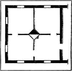 Вариант размещения печи для отопления четырех комнат показан на рисунке 20. Такая печь имеет большие размеры и занимает много места. Кроме того, ее стенки выделяют тепло пропорционально потерям каждой комнаты. В этом случае две комнаты проходные.