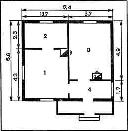 В нашем случае имеется дом размером по наружному обмеру 6,6x7,4 м, высота помещения 3 м. Стены кирпичные, толщиной 540 мм. В доме имеются две жилые комнаты 1, 2, кухня 3 и прихожая 4 (рис. 22).
