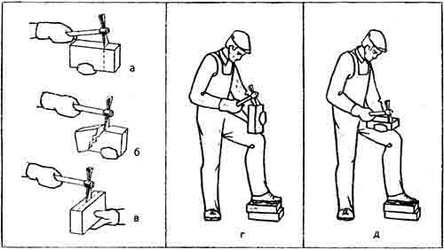 Насечку делают по всему периметру раскалываемой части глубиной до 5 мм. Во время раскалывания кирпич берут поперек левой рукой, правой держат молоток или кирочку и наносят в нужное место достаточно сильный удар, чтобы расколоть его. При этом лезвие молотка или кирочки должно быть направлено под прямым углом по отношению к кирпичу или линии раскалывания. Косой удар часто приводит к произвольному раскалыванию. Кирпич раскалывается одним ударом или несколькими, нанося один удар сильнее другого, пока кирпич не расколется. Во время раскалывания кирпич держат или по середине линии, или за большую его часть. Правильное и неправильное раскалывание кирпича показано на рисунке 23, а, б. Раскалывание кирпича вдоль показано на рисунке 23, в. При теске кирпича его берут левой рукой, которая должна опираться на левую ногу, немного выше колена, нога находится в полусогнутом положении. Сторона отески повернута к лицу. Сперва выполняют грубую отеску более тупым концом с нанесением более сильных ударов инструментом, а затем острым концом наносят частые несильные удары (рис. 23, г). Колка кирпича показана на рисунке 23, д.