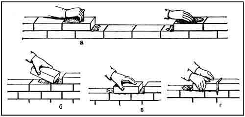 а — наложение и разравнивание рукой глиняного раствора; б — хватка кирпича для укладки; в — подгребание раствора ребром; г — прижатие кирпича на место с выдавливанием раствора