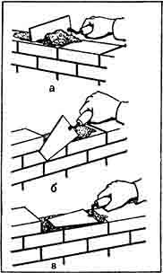 В печной кладке применяют различные виды швов на глиняном растворе (рис. 26). Если кладка будет оштукатуриваться, то для лучшего удержания раствора штукатурки швы оставляют незаполненными или впустошовку, если без оштукатуривания, швы заполняют полностью и раствор сравнивают в одной
