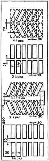 На рисунке 4 показано четыре ряда укладки сырца. Последующие ряды укладывают в такой же очередности. Пятый ряд кладут, как первый, но только расстояние между рядами оставляют 15 мм, шестой ряд, как второй, с расстоянием между рядами 10 мм, седьмой ряд, как третий, с расстоянием между рядами 5 мм и т. д. Штабеля рекомендуется ставить высотой не более 1 м.Рис. 4. Схема укладки кирпича для сушки