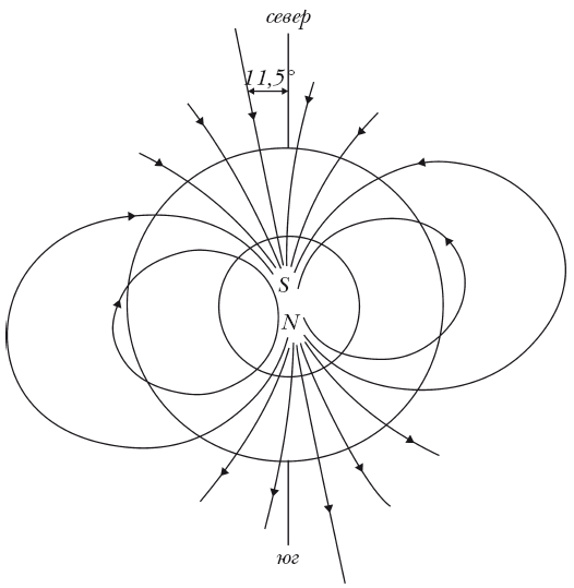 Известно, что у каждого магнита есть отрицательный и положительный полюса, и у этого огромного магнита тоже, только их называют Северный и Южный полюса. Благодаря тому, что эти полюса почти совпадают с географическими с небольшим отклонением (около 12°) (рис. 12), компас и работает.