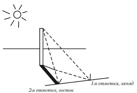 Узнать направление севера по Солнцу можно не только в полдень, но и в другое время. Для этого нужно поставить вертикальную палку, отметить место окончания ее тени (запад). Через 15–20 мин отметить новую тень от палки, провести линию между отметками (линия восток – запад). Теперь нужно встать спиной к палке, левой ногой к началу отрезка, а правой – к концу. Направление, куда вы смотрите, и есть север (рис. 13).
