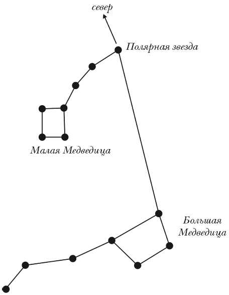 2) от правых крайних звезд ковша провести линию, равную 5 отрезкам расстояния между этими звездами – вы наткнетесь на окончание ручки ковша другого созвездия – Малой Медведицы, оно же Полярная звезда (конечно, можно и сразу найти Малую Медведицу, но она не так ярка, как Большая) (рис. 14).