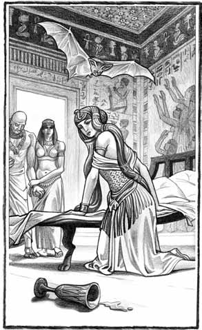 А потом пришел ответ. Боги ответили на мой призыв. Оконная створка вдруг с грохотом распахнулась, и в комнату, бесшумно взмахивая крыльями, влетела та огромная летучая мышь, которую я последний раз видел висящей на подбородке мертвого евнуха, когда мы с Клеопатрой были в недрах пирамиды Херу. Трижды она облетела комнату, потом зависла над мертвой Ирас, а после порхнула к умирающей Клеопатре и опустилась ей на грудь, вцепившись в изумруд, извлеченный из мумии Менкаура, где покоился много тысячелетий. Трижды это белое воплощение ужаса громко вскрикнуло, трижды ударило перепончатыми огромными крыльями и – о чудо! – исчезло, как будто его и не было.