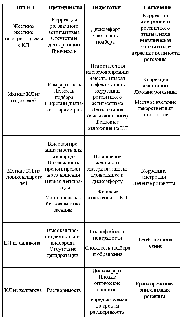 Гидрогелевые КЛ из полимеров с различным влагосодержание получили широкое распространение благодаря большему комфорту простоте подбора этих линз по сравнению с КЛ из жестких полимеров. Однако, несмотря на целый ряд явных достоинств, гидрогелевые имеют и недостатки, основным из которых является недостаточная для нормального метаболизма роговицы газопроницаемость линз, что в ряде случаев приводит к развитию гипоксических осложнений (табл. 1).