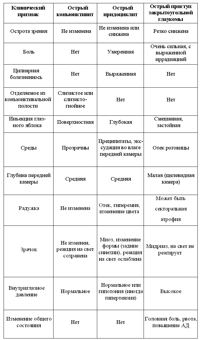 Острый иридоциклит следует дифференцировать в первую очередь с острым приступом закрытоугольной глаукомы и острым конъюнктивитом. Основные параметры дифференциальной диагностики приведены в табл. 2.