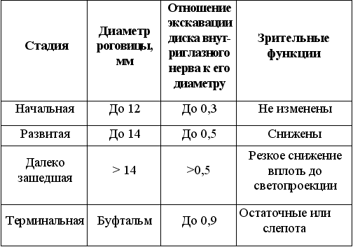 Стадию глаукомного процесса определяют по степени увеличения диаметра роговицы, расширения экскавации диска зрительного нерва и снижения зрительных функция (табл. 3).
