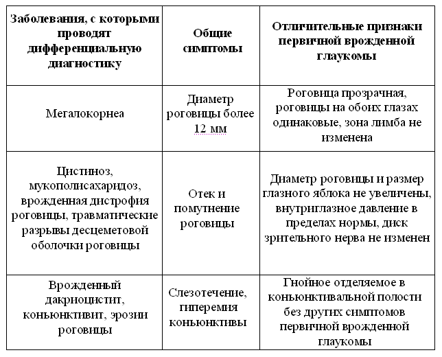 Таблица 4. Принципы дифференциальной диагностики первичной врожденной глаукомы.