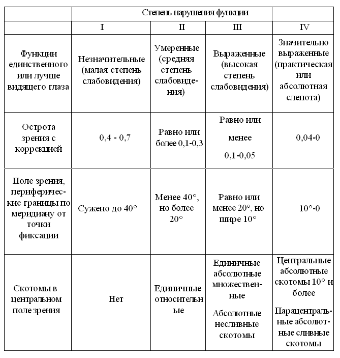 Интегральная оценка функционального состояния зрительного анализатора с учетом Международной классификации болезней (МКБ X пересмотра. ВОЗ. Женева) позволяет выделить 4 степени (табл. 5) тяжести его нарушений: I – малая степень слабовидения; II – средняя; III – высокая; IV – практическая или абсолютная слепота.