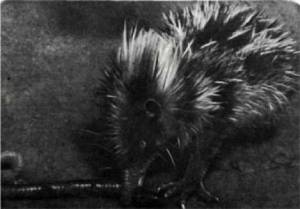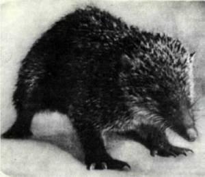 Не все ежи колючие, есть и без иголок. Четыре их вида – в Южной Азии (один – только на Филиппинах, два – кроме материковой Азии, на Калимантане и Суматре). У всех крысиные хвосты и 40 зубов (у наших ежей их 36). Самый внушительный из шерстистых ежей – большой гимнур, пожалуй, и самый крупный насекомоядный зверь вообще: длина его от носа до корня хвоста 40 сантиметров, да еще хвост вполовину того. Известно, что у гимнура под хвостом (у основания) мускусные, резко пахучие железы, что днем прячется он в расщелинах скал и в дуплах поверженных ветром деревьев, ест фрукты и насекомых. Больше, кажется, ничего не известно.