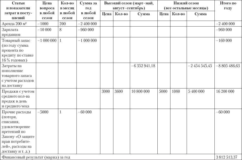 Инвестиции размером примерно в 1 млн руб. на запуск франшизы плюс еще 1 млн на товарный запас, окупаемость около года, в дальнейшем доход «грязными» около 3,5 млн руб. вместо 5 млн руб. в год.
