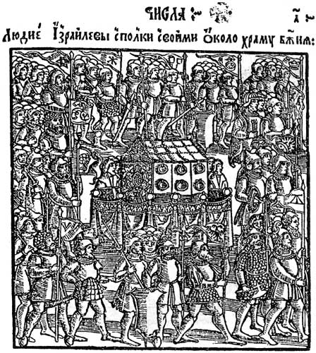 Рис. 0.2. Гравюра из Библии Франциска Скорины, изданной якобы в 1517–1519 годах. Израильские = богоборческие войска в походе. Обратите внимание на знамена, развевающиеся над войском. Взято из [71], т. 1, с. 453.