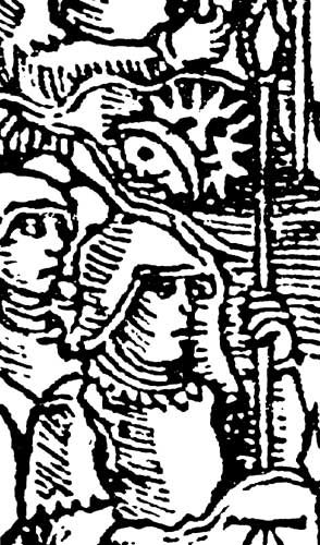 Рис. 0.4. Фрагмент старинной гравюры из Библии Скорины. Полумесяц со звездой (в виде серпа Луны и Солнца-звезды) на знамени другого колена Израиля. Это знамя изображено впереди богоборческого = израильского войска. Вероятно, это османское = атаманское знамя. Взято из [71], т. 1, с. 453.
