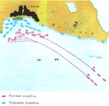 Русские корабли, стремясь быстрее сблизиться с противником, вошли в бухту двумя кильватерными колоннами. Под градом ядер и книпелей они встали против турецких кораблей и сами открыли ошеломляющий огонь.
