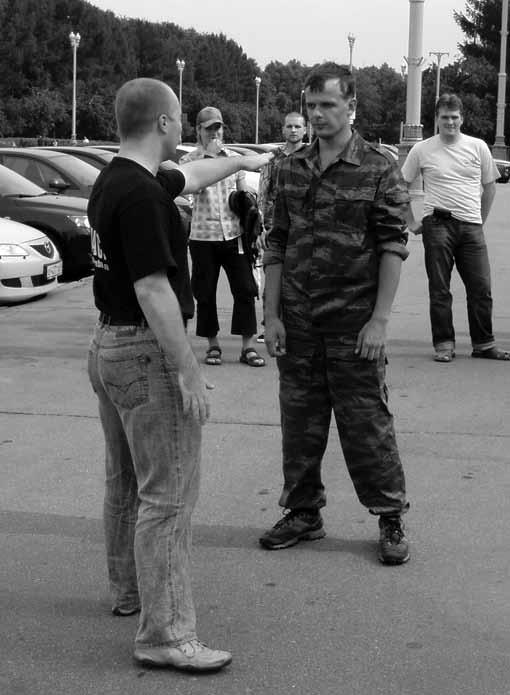 положения рук. Как потенциальный злоумышленник держит руки? Если в карманах, или за спиной, или полез в сумку или за пазуху, это для вас сигнал тревоги! Сжимает кулаки, скрючивает пальцы, делает небольшие подергивания конечностями, это уже должно вас насторожить. Помните: первый удар, так же как и второй или третий, может быть нанесен ударно-колющим орудием, а возможно, после удара рукой или ногой против вас применят нож.• Фактор одежды. Помимо фактора возможности спрятать оружие в одежде вы должны просчитать возможные действия приближающегося незнакомца: длинное пальто ограничивает работу ногами и сковывает амплитудные удары руками, наличие шапки, высокого воротника в схватке будет ему затруднять обзор, если у него на ногах «гриндерсы» или боты типа «милитари», не следует допускать удара ногой в случае нападения.