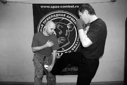 • Фактор климатических и временных изменений. Время дня: утро, день или ночь – накладывает изменения на выбор алгоритма действий: днем при нападении можно бежать туда, где больше людей, в оживленное место, ночью, скорее всего, там будет безлюдно. Дождь, снег, ветер или, наоборот, сильная жара влияют на внимательность, мешают замечать угрозу и исключают ряд защитных действий, тем самым затрудняя самооборону.Ваши действия при обнаружении любых двух из вышеперечисленных признаков: слегка пригнуться, собраться психологически, отставить одну ногу назад и вбок, перенести 60 % веса тела на нее, передней рукой почесывать бровь или висок, одна рука запястьем подпирает локоть другой. Запрещено: держать руки в карманах, за поясом, скрещивать на груди (даже если у вас бицепс, как у Саши Невского, а трицепс больше, чем у Арни Шварценеггера, – из этого положения очень трудно сделать защитное движение). Необходимо держать в поле зрения кисти и стопы оппонента, отслеживать периферией заход с флангов «друзей». При резком движении в вашу сторону (на скорости можно и не увидеть, есть ли в руке нападающего нож) следует провести остановочный удар в колено с вашей передней ноги одновременно с защитой двумя руками.