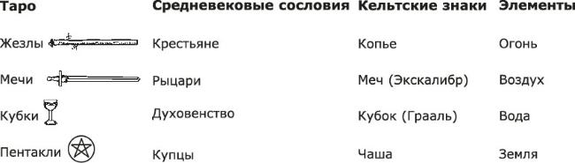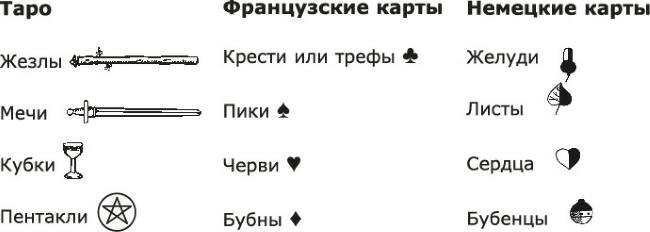 О первоначальном смысле этих четырех символов ведутся многочисленные дискуссии. Некоторые считают их знаками четырех сословий, существовавших в Средневековье, другие – святыми знаками древних кельтов или атрибутами индийских божеств. Кроме того, знаки Таро сравнивают с четырьмя классическими стихиями.